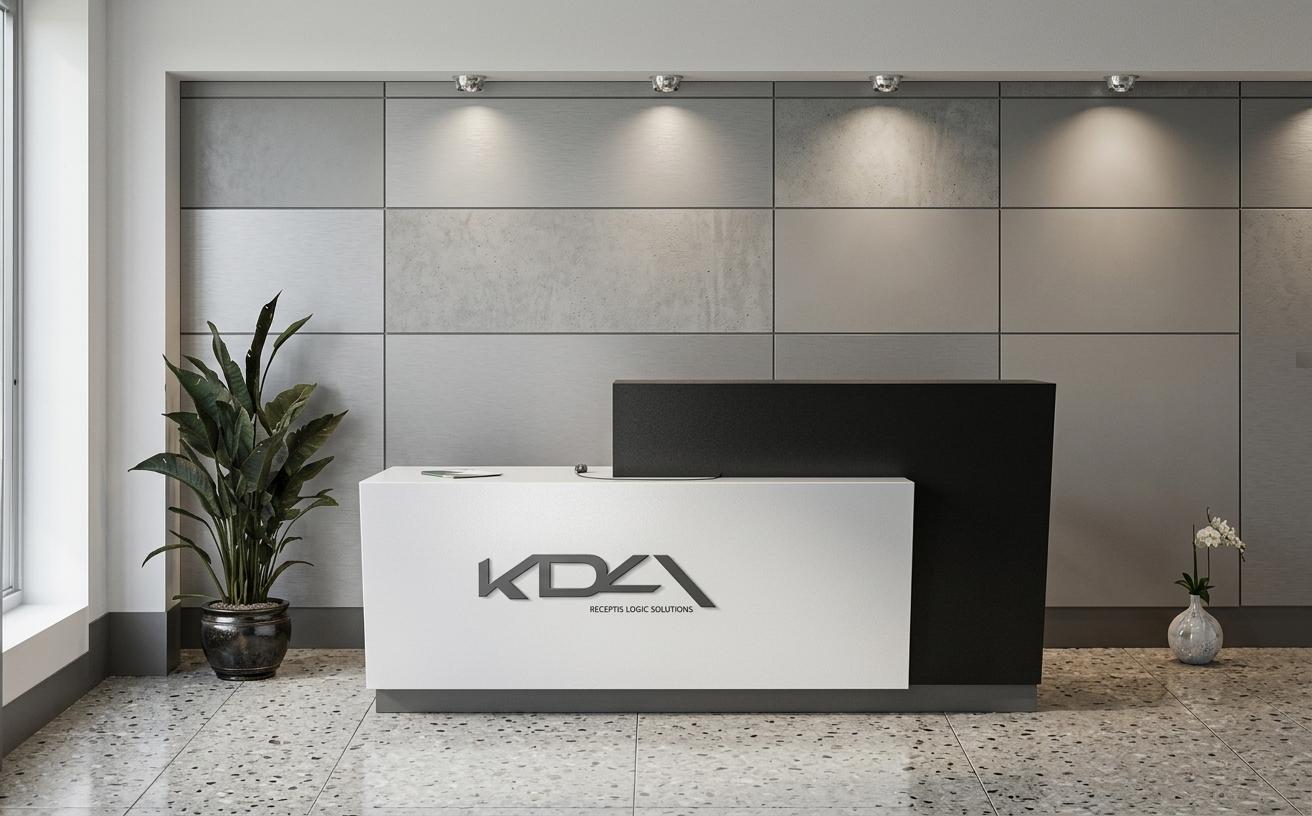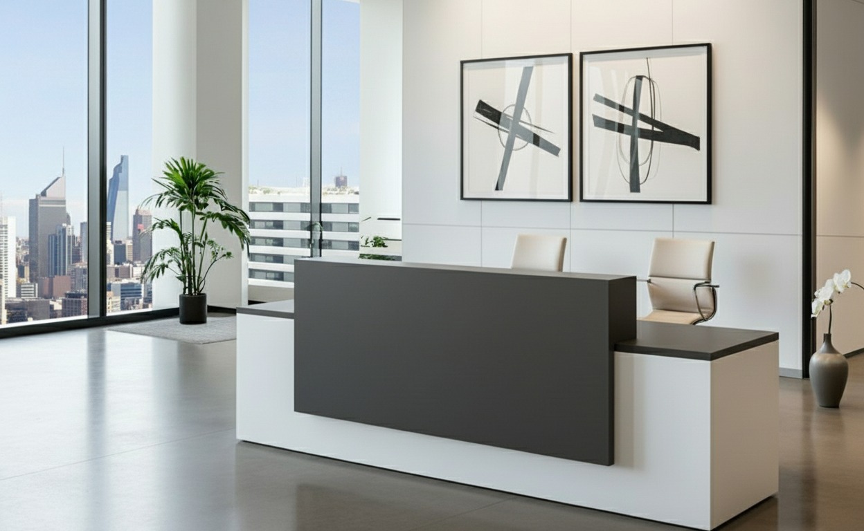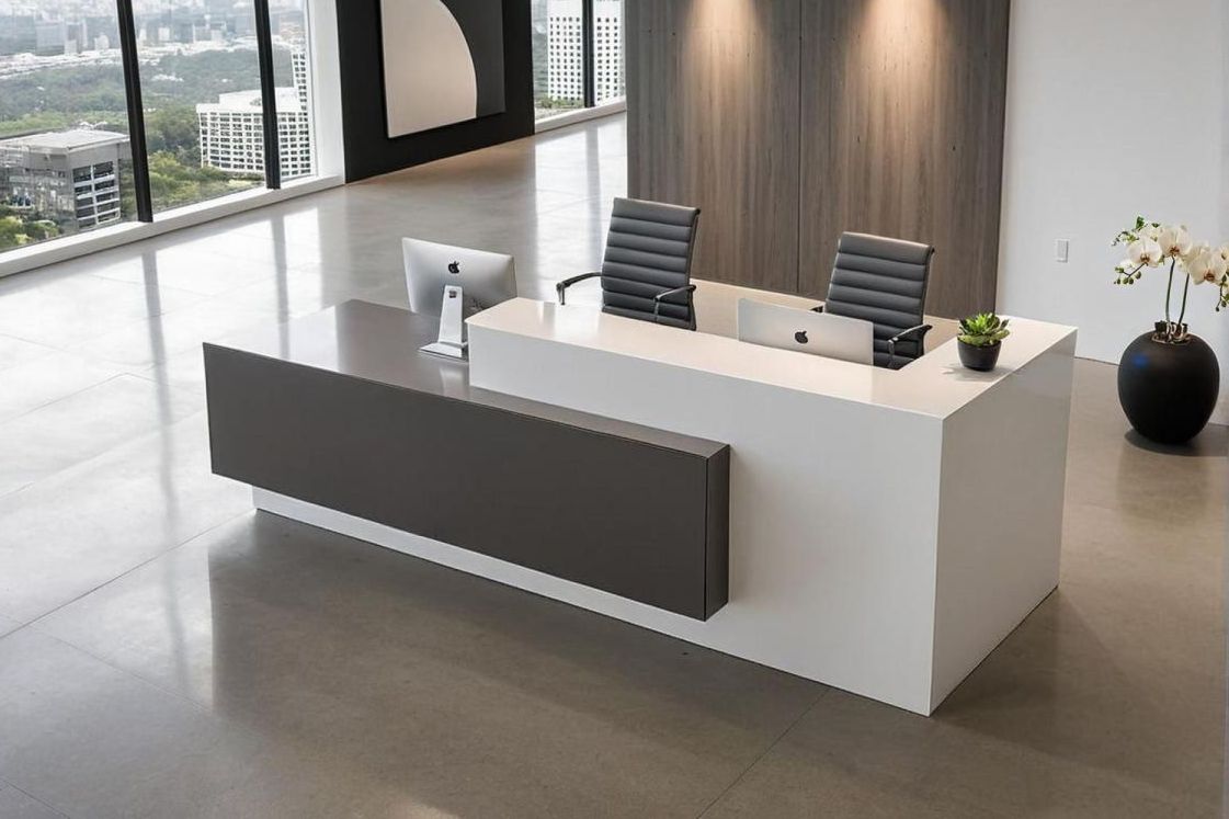 minimalista recepciós pult modern irodai recepcióhoz fehér és sötét design kivitelben