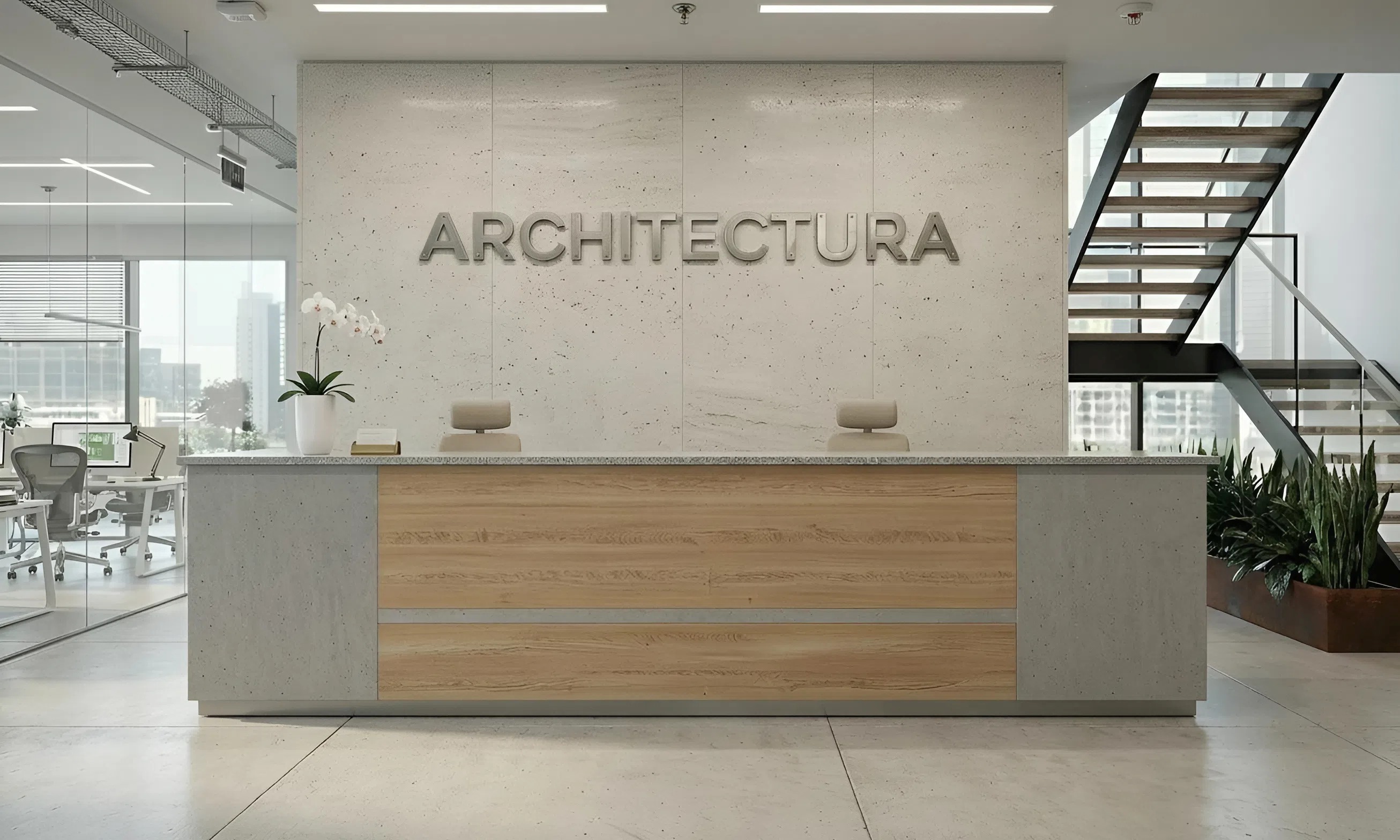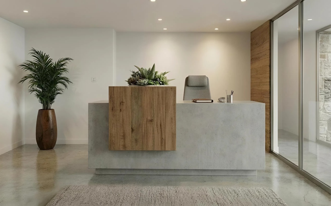 minimalista design recepciós pult modern irodai recepció bútor fautánzat elemekkel elegáns ügyfélfogadó térbe