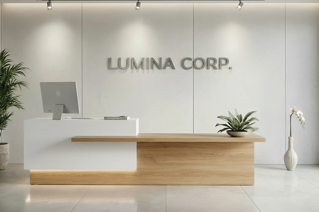 minimalista recepció dió-fehér színben egy modern irodai környezetben