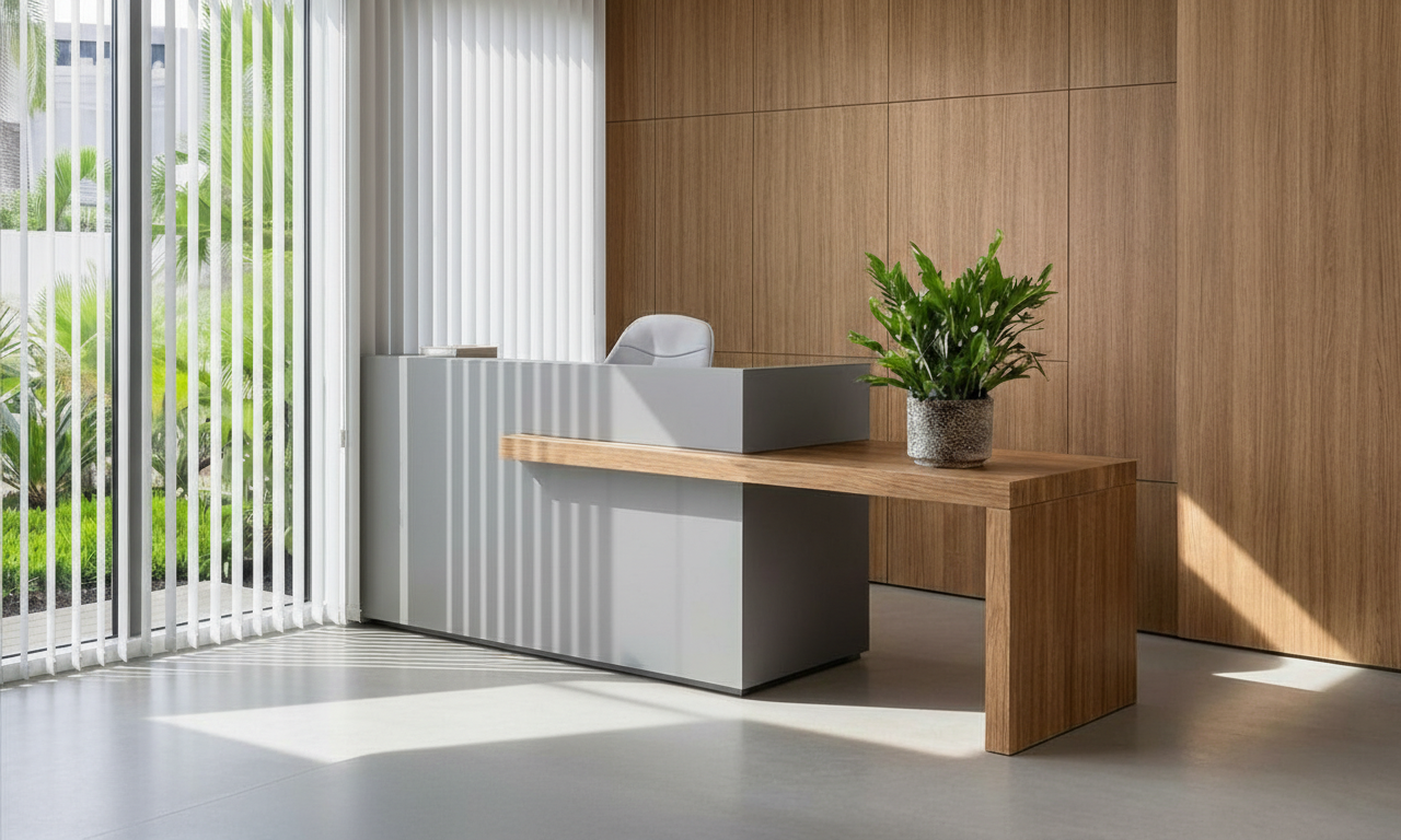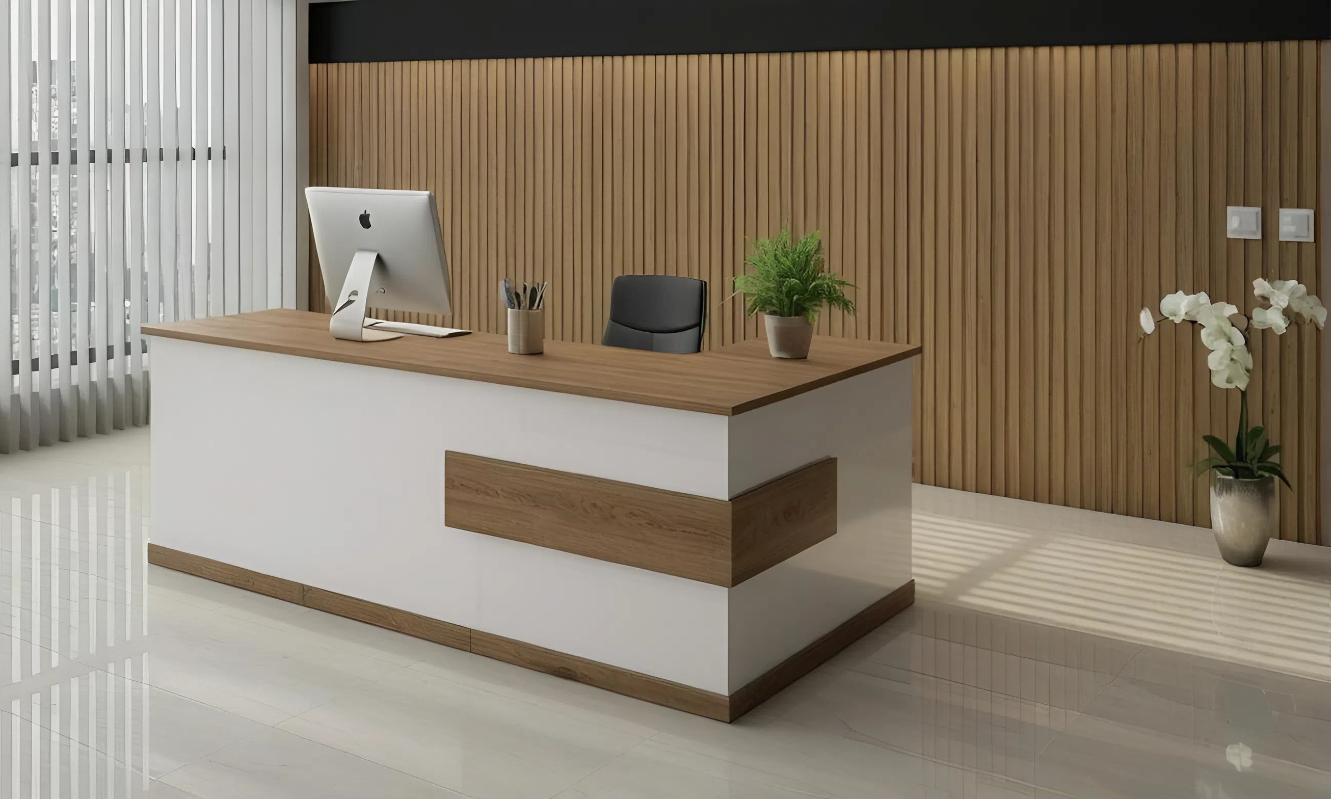 modern design recepciós pult világos fa és fehér színkombinációban elegáns irodai recepcióhoz