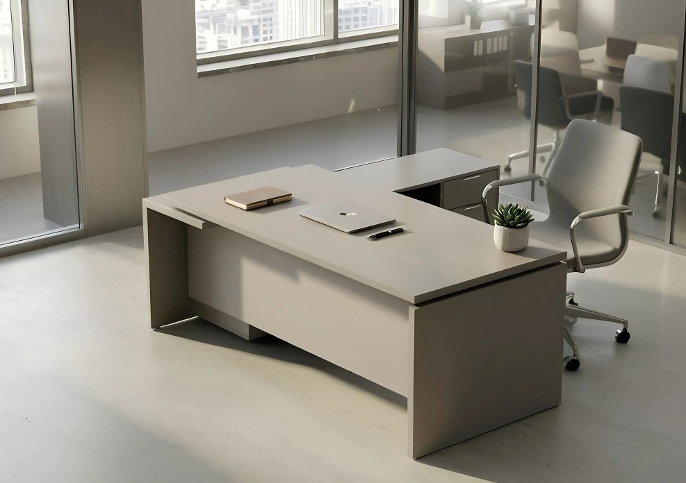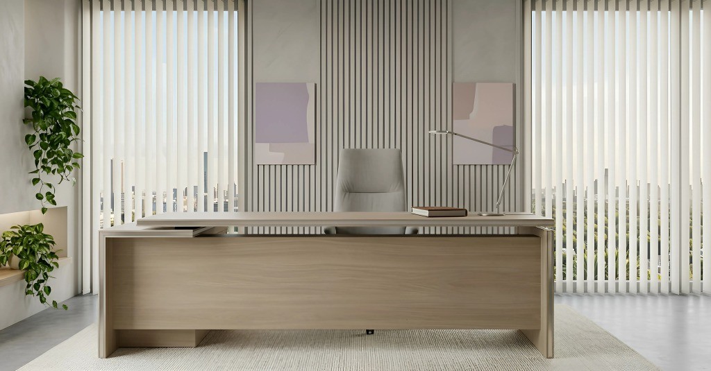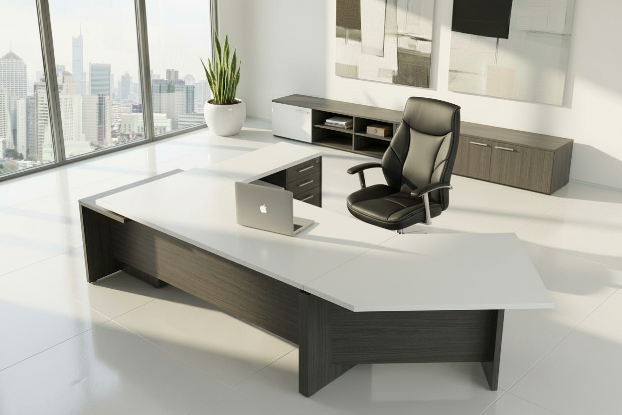 A NOORI vezetői íróasztal egy modern, minimalista és elegáns megjelenésű vezetői irodabútor, amely meghatározó eleme lehet bármilyen igényes irodaberendezésnek. Az asztal karakterét az átfedéssel kialakított dupla asztallap adja.